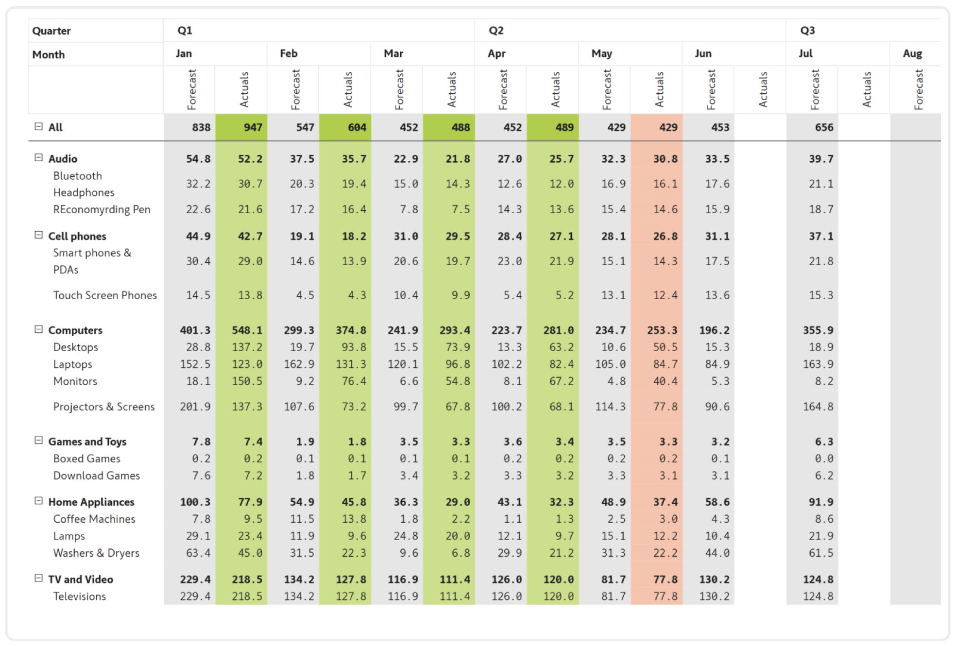 Aprovecha una combinación poderosa de diseños de informes, disposición de medidas y formato de celdas y valores para entregar informes similares a Excel.
